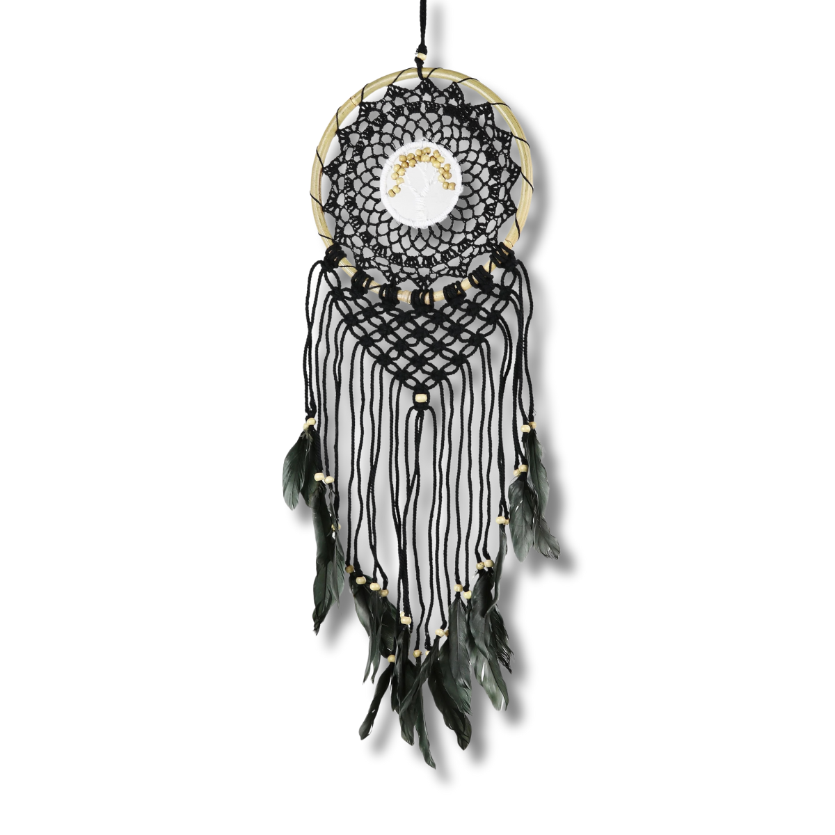 Der indianische Traumfänger sorgt für ungestörten Schlaf und angenehme Träume und ist eine schöne Dekoration. Dieses schützende Amulett funktioniert wie ein Spinnennetz. Negative Gedanken und Albträume fängt der Traumfänger in seinem Netz ein, und das morgendliche Sonnenlicht zerstört sie. Schöne Träume gleiten auf den Federn zurück in die Seele des schlafenden Menschen. Traumfänger sind eine sehr alte indianische Tradition. Die ursprünglichen Traumfänger stammen vom nordamerikanischen Stamm der Ojibwe. Ein traditioneller Traumfänger wird von Hand aus einem Holzring hergestellt, an dem ein Netz aus natürlichen Fasern gewoben ist. Der Ring ist normalerweise mit Federn und Perlen geschmückt. Die Einhaltung der Tradition ist uns sehr wichtig, und deshalb stellen wir Traumfänger von Hand aus allen genannten Materialien her. Eine alte Geschichte erzählt, dass Traumfänger ursprünglich nur über die Wiegen kleiner Kinder gehängt wurden. Laut der Legende der Ojibwe kümmerte sich eine Spinnenfrau namens Asibikaashi um alle Kinder in der Umgebung, aber der Stamm wuchs allmählich, und es wurde für sie immer schwieriger, alle Kinder zu schützen. Deshalb erhielt sie Hilfe von Müttern und Großmüttern, die begannen, diese Traumfänger herzustellen.